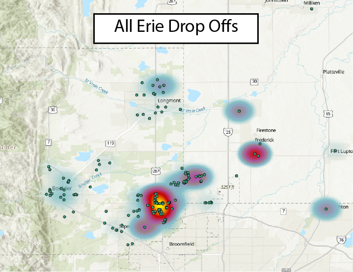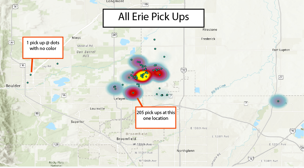 Here are graphics I made to show pick up and drop off data in Erie Colorado.